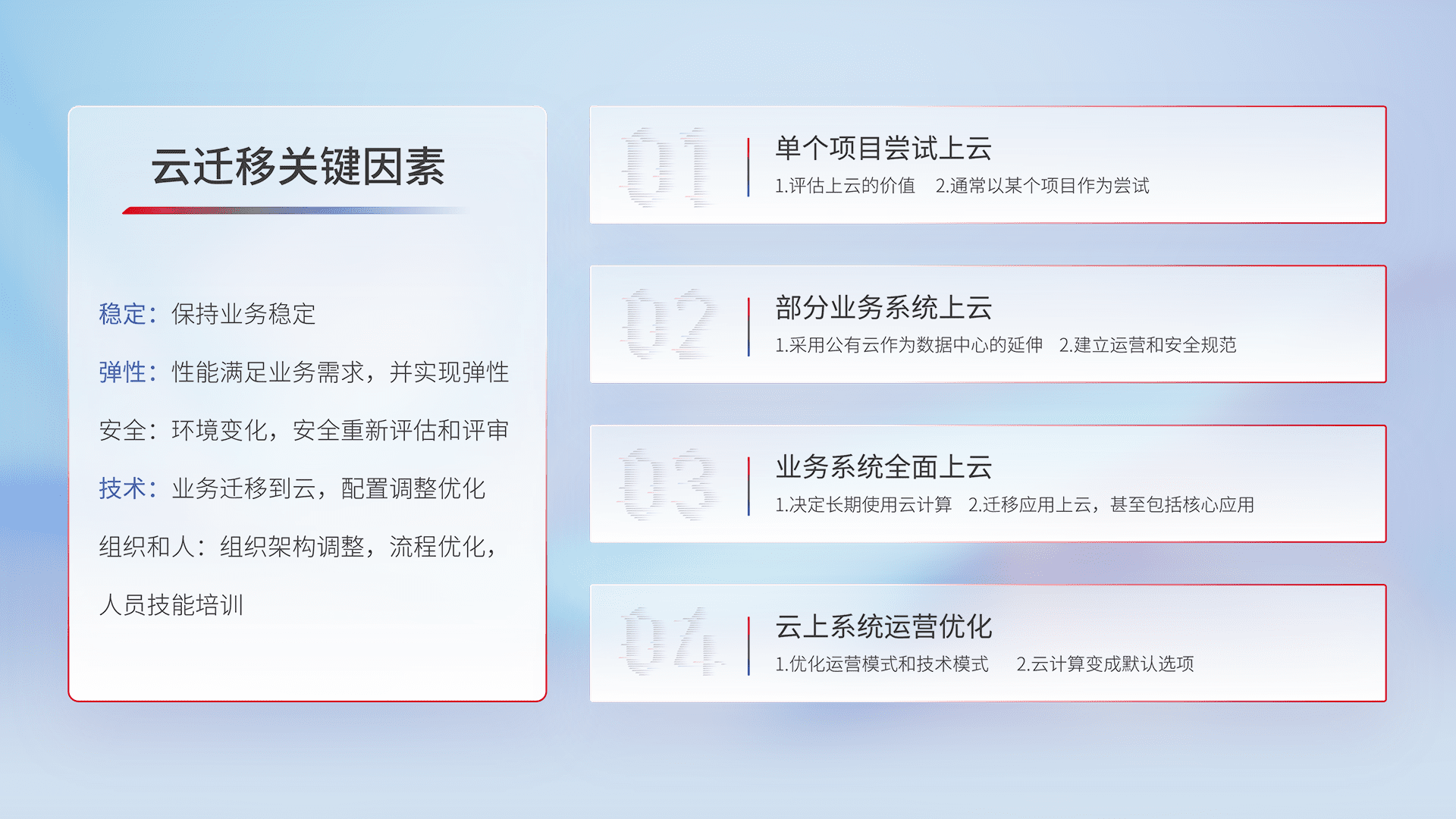 结合实际业务,,,从规划设计、、、云平台选型、、、、云原生改造、、数据迁移、、、集成交付,,,,迁移全过程为客户识别最佳上云路径,,做好风险识别管理,,设计网络架构、、、身份权限、、、安全审计合规、、、操作审计、、日志审计、、、、监控告警策略、、、多站点容灾设计等,,,,对云上基础设施进行整体规划,,,,提升IT治理水平,,以满足弹性、、、、高可用、、、、高性能的需求。。。